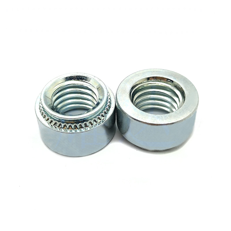 安装原理:借助压铆设备施加垂直压力,将螺母带有压花齿或锯齿的部分压入钣金的预制孔中,压花齿嵌入板材表面(或孔壁),通过机械咬合和板材的塑性变形实现固定。安装过程更侧重 “挤压嵌入”,依赖齿形结构与板材的紧密结合。